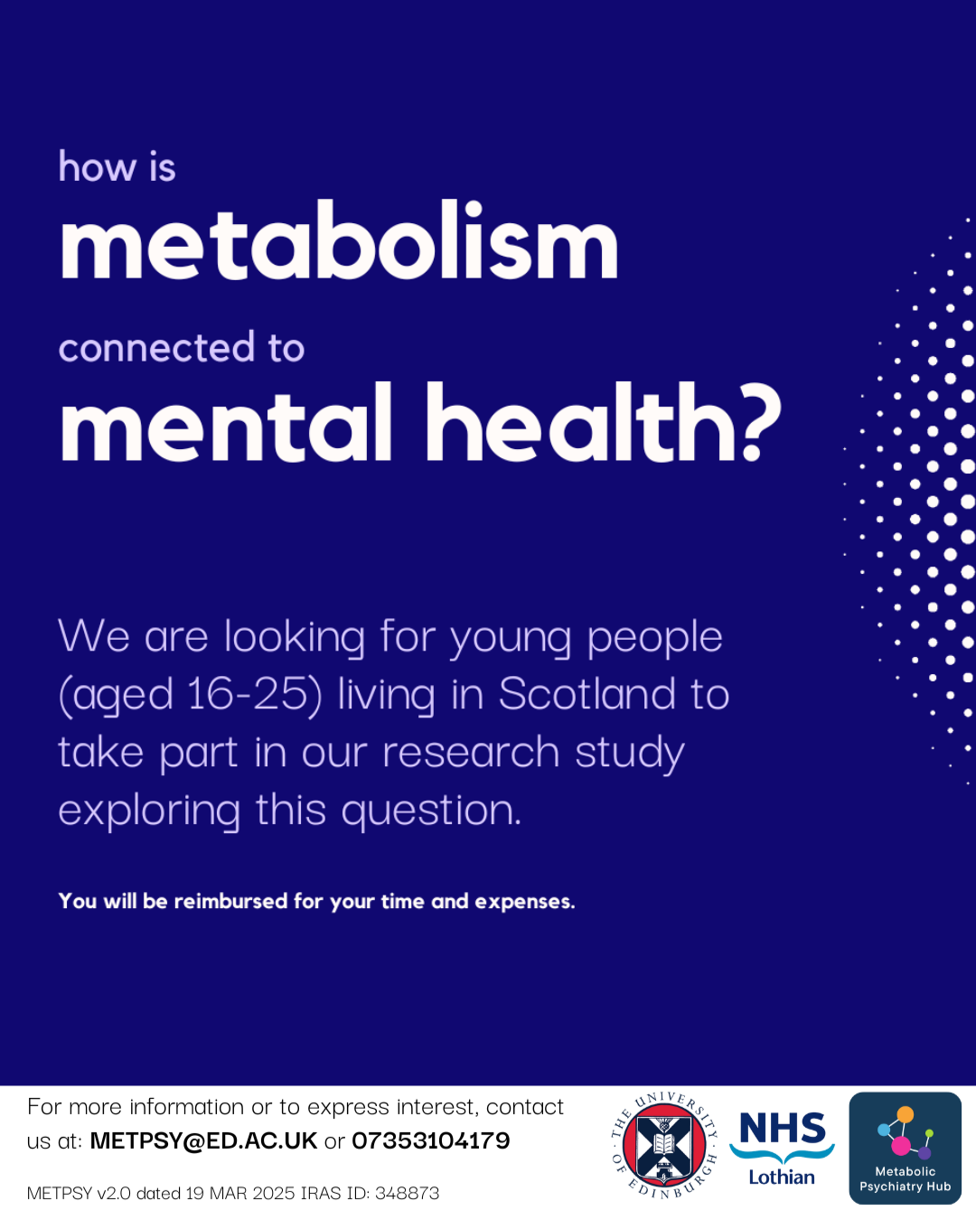 For more details about both opportunities, please visit the Hub for Metabolic Psychiatry's Take Part page or get in touch with us at metabolicpsychiatry@ed.ac.uk